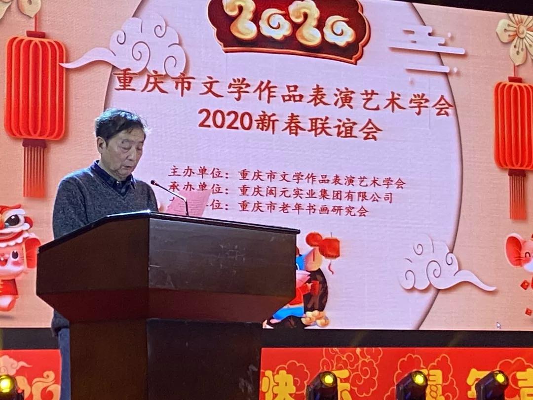 1月19日下午,重庆市老干部活动中心洋溢着喜庆祥和的节日气氛,重庆市文学作品表演艺术学会2020新春联谊会在这里倾情上演。重庆市文学作品表演艺术学会的名誉会长、副会长、常务理事、会员以及作家、艺术家、书画家等300余人参加了新春联谊会。重庆市作家协会荣誉主席黄济人发表致辞,他对学会自成立以来取得的各项成就表示祝贺并献上新年祝福。重庆市文学作品表演艺术学会会长郝鹏寿总结了学会2019年的工作。
