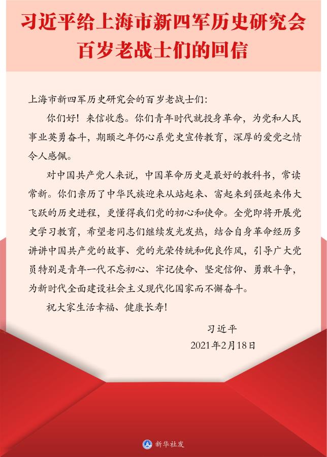 图表:习近平给上海市新四军历史研究会百岁老战士们的回信 新华社发