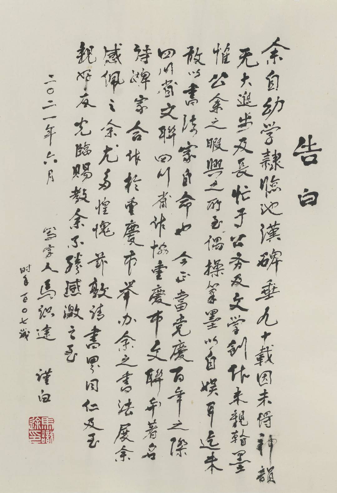 马老曾在北京、成都等地举办多次书法个展。此次回到家乡重庆,马老在开展前夕,挥毫写下一封《告白》,表达自己的感谢,并自述书法研习心得,“余自幼学隶临池汉碑,垂九十载,因未得神韵无大进步,及长忙于公务及文学创作,未亲翰墨。惟公余之暇,兴之所至,偶操笔墨以自娱耳,迄未敢以书法家自命也。今正当党庆百年之际,四川省文联、四川省作协、重庆市文联与著名诗婢家合作于重庆市,举办余之书法展。余感佩之余,尤多惶愧,兹敦请书界同仁及至亲好友光临赐教,余不胜感激之至?!?/p>
