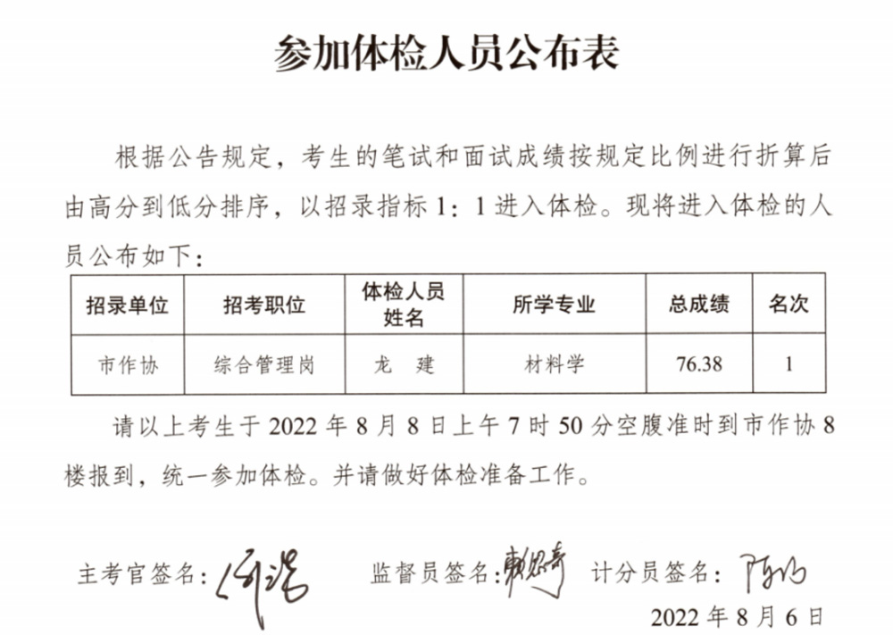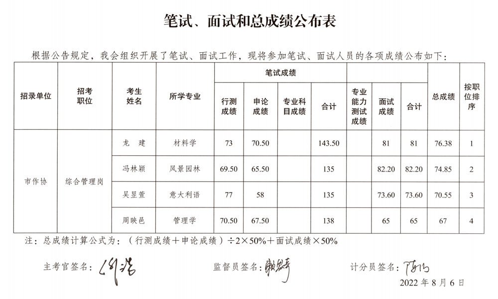 重庆市作家协会2022年度公开考试录用公务员笔试、面试总成绩及参加体检人员公布表