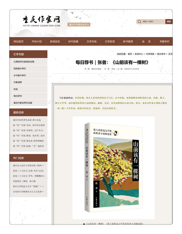 为丰富市民精神文化生活,市作协还开展了“文化大餐·晒作品读好书”系列线上文学活动。截至23日,已在重庆作家网“每日荐书”栏目推荐张者、刘建东等4位鲁迅文学奖获奖作品,在“重庆作家优秀作品展”栏目展出本土作家作品3部。