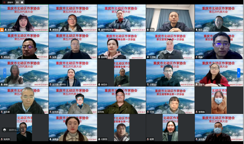 重庆市北碚区作家协会第五次代表大会于2022年12月26日成功举行??悸且咔榉揽匦枰?,减少人员聚集,经筹备工作组申请,北碚区文联、区民政局同意,此次会议采取线上方式举行。重庆市作家协会党组书记、专职副主席何浩,北碚区委宣传部常务副部长张汝国,北碚区文联主席周洪玲,重庆大学教授、鲁迅文学奖获得者、重庆市作家协会副主席李永毅等应邀出席会议。