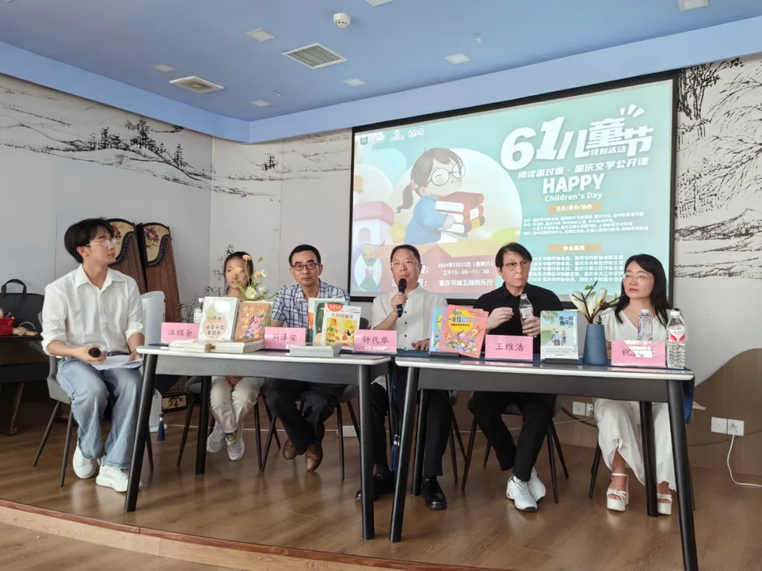 书香浸润心灵,阅读点亮未来。随着全民阅读持续深入推进,如何引导少年儿童多读书、读好书,需要全社会来思考和关心。在“六一”儿童节即将到来之际,5月25日,重庆文学公开课特别推出“重庆儿童文学作家漫谈及作品分享”单元。钟代华、王维浩、刘泽安、?;嫣巍⑼粽延?位儿童文学作家齐聚重庆书城与小读者们谈心。作家们畅谈自己的儿童文学创作故事,并与到场的家长孩子展开交流。不少听众纷纷表示收获良多。