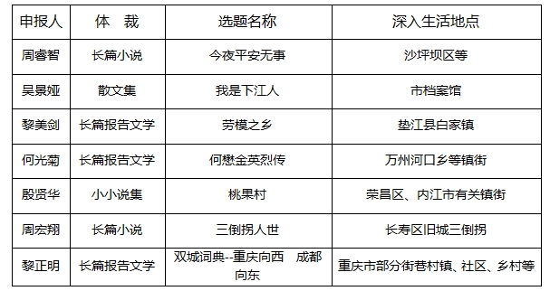 重庆市作家协会2024年度定点深入生活项目经评估论证,并经重庆市作家协会办公会审核同意,确定以下7个项目入选。现予公布。