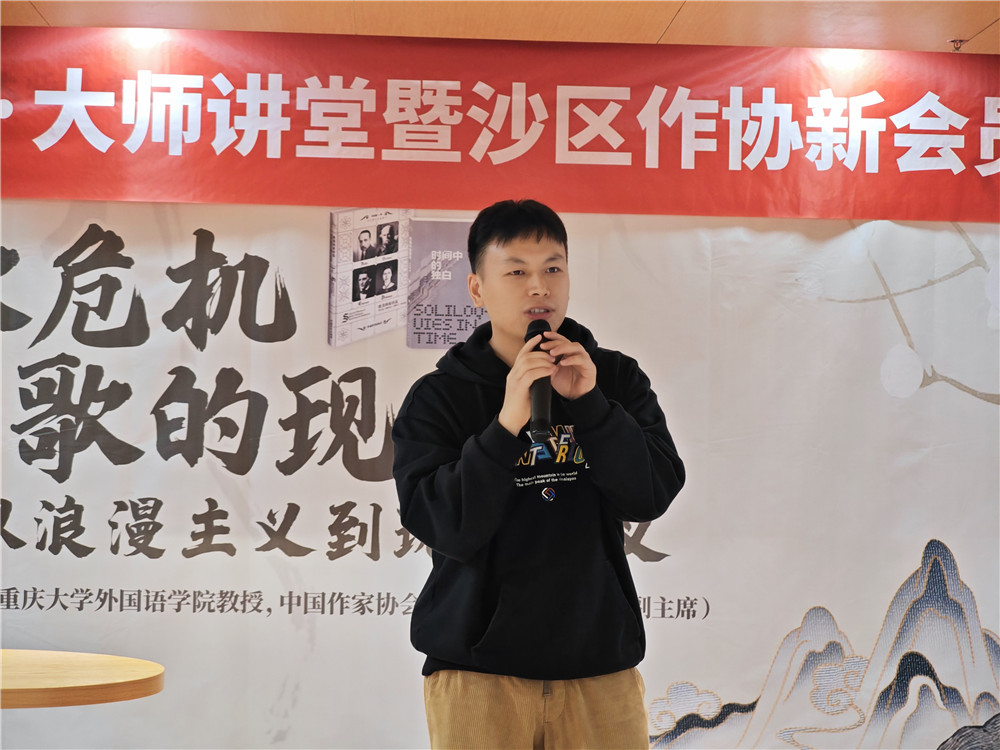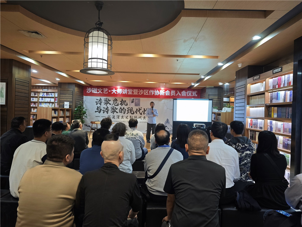 10 月 26 日,由沙坪坝区文联、沙坪坝区作家协会主办的“诗歌危机与诗歌的现代性”文学主题讲座暨沙坪坝区作家协会新会员入会仪式在沙坪坝书城举行。重庆市作家协会副主席、重庆大学外国语学院教授、第七届鲁迅文学奖翻译奖获得者李永毅以“诗歌?;胧璧南执裕捍永寺饕宓较执饕濉蔽?,为到场的区内外作家和文学爱好者带来了一场精彩的诗歌讲座。此次活动是重庆市作协“作家走基层”系列活动之一,也是沙坪坝区作协“文学在场·主题志愿服务活动”的赓续。沙坪坝区作协主席刘清泉主持活动。
